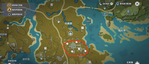 五塊古代石碑都在歸離原中間,碑位分布位置如下圖所示。原神